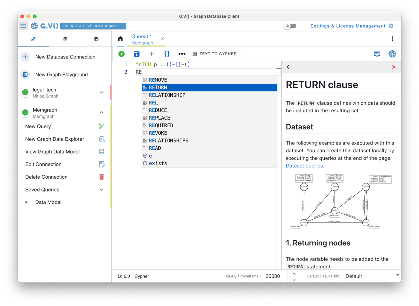 As language-specific keywords such as MATCH or RETURN are highlighted or suggested inside the G.V() query editor, their provider-specific documentation will be shown in the query assistant to the side.