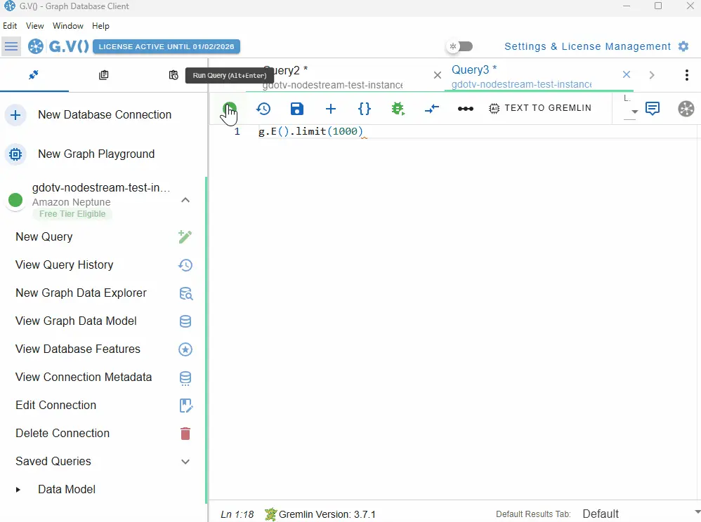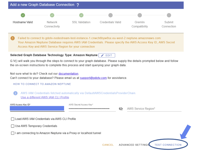 Connecting to your Amazon Neptune or Neo4j database with G.V() takes only a few seconds. You just need to click New Database Connection, enter the location of your database along with your authentication credentials, and hit Test Connection: