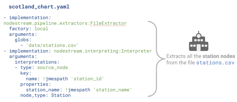 , like the station name, for the node. That’s because the station name has already been defined in the previous pipeline! Last time (in the employees example) we created the source node along with the relationship. This time, we’re referencing an existing node. All we need is the key