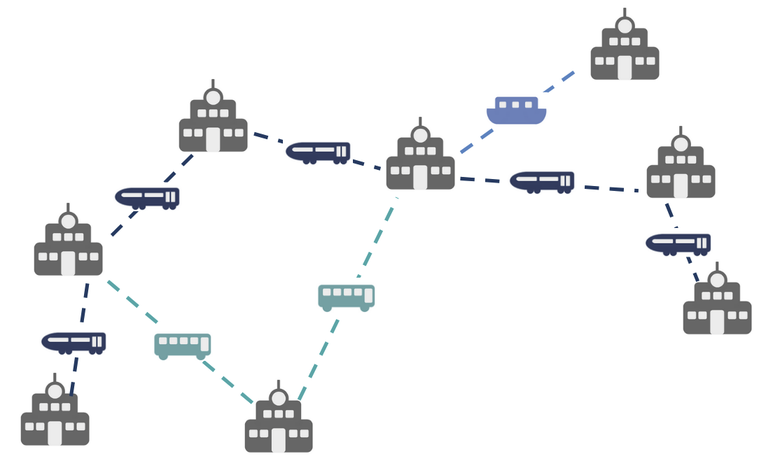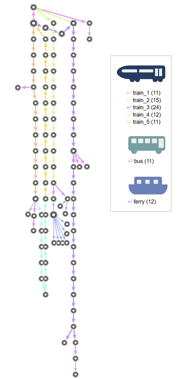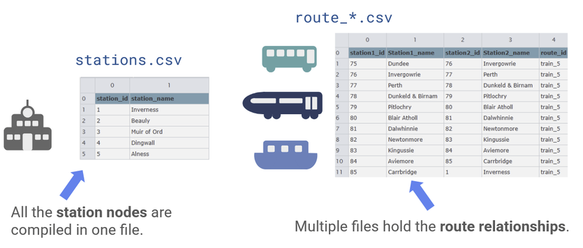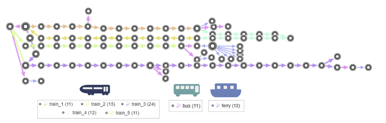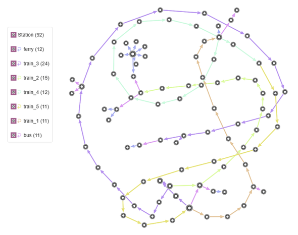 We’ll map out various station nodes, which could be connected by train, bus or ferry edges. That means our data model will look something like this:
