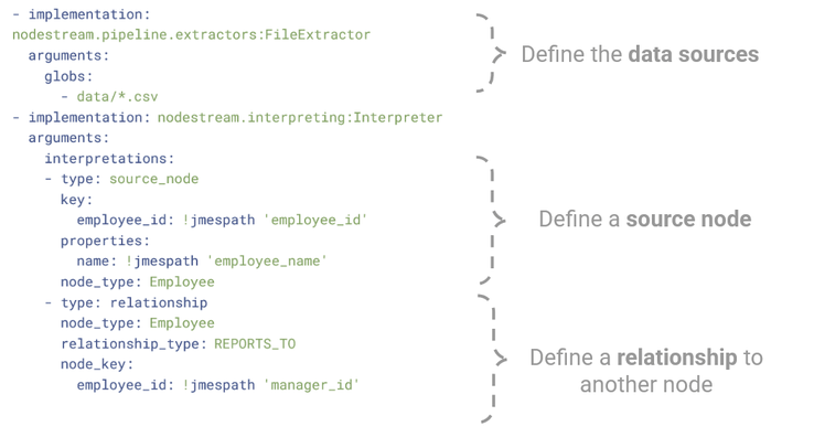 The second part lets the code know how to interpret the input data as a series of nodes and relationships. It generates nodes with a key based on the employee_id